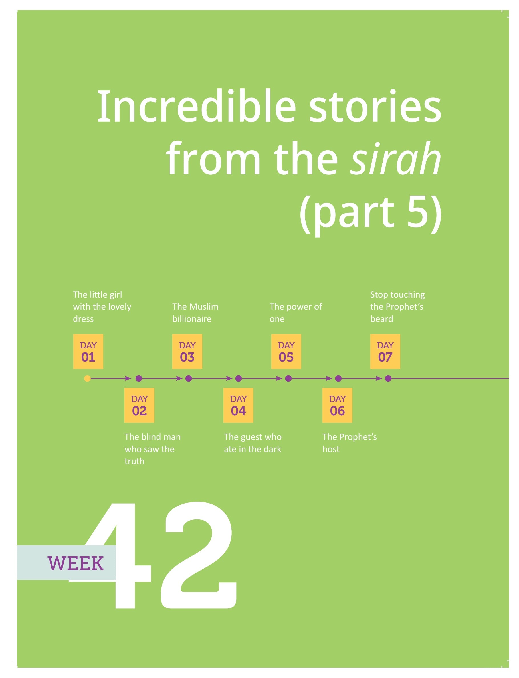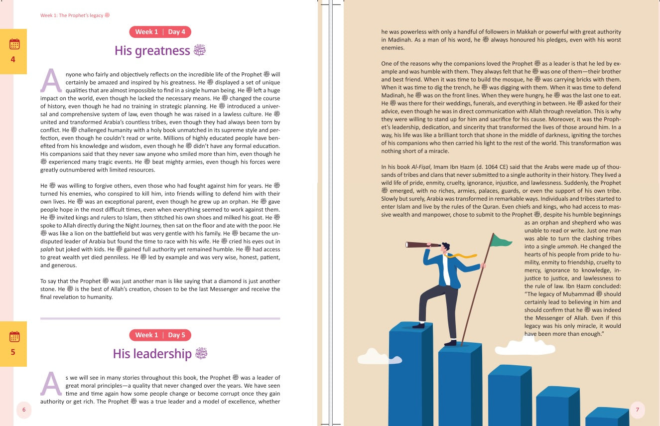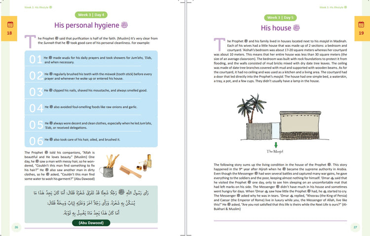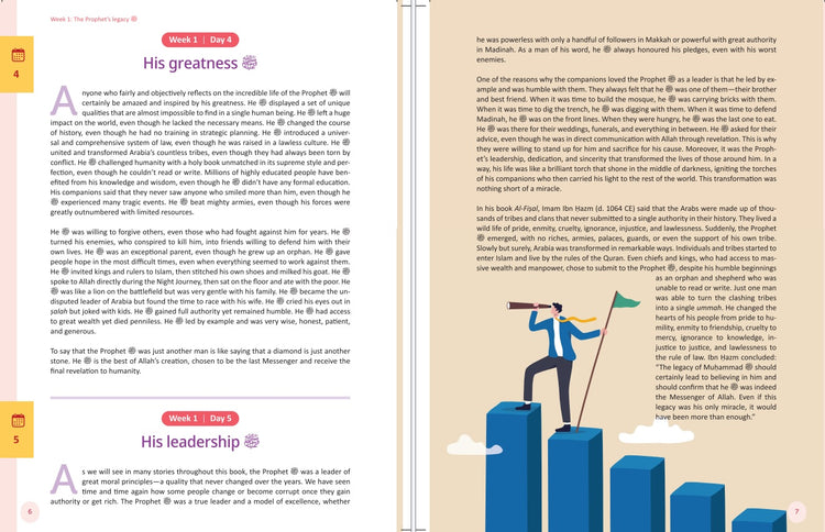 • Each of the 52 weeks of the year covers a theme from the Prophet's sirah. These themes have been carefully selected in order to reflect the timeless excellence and superior wisdom of the Prophet ﷺ . Every theme is supported with amazing stories and examples, followed by a short quiz to make sure you have mastered the current theme.